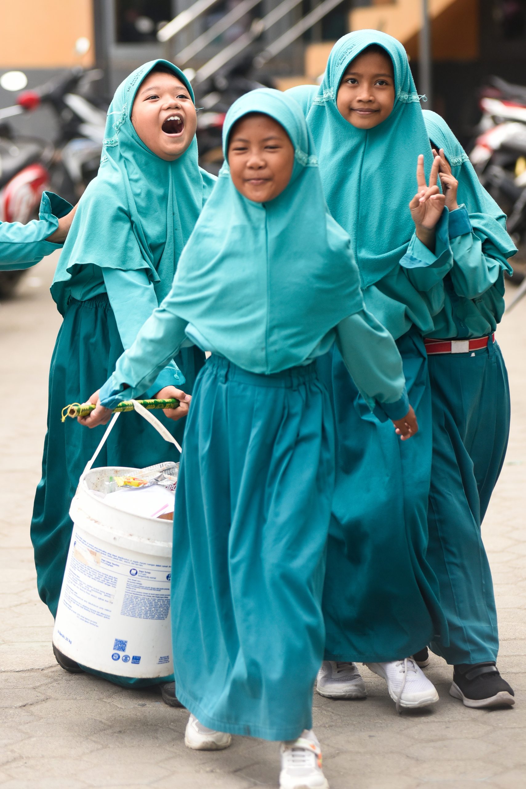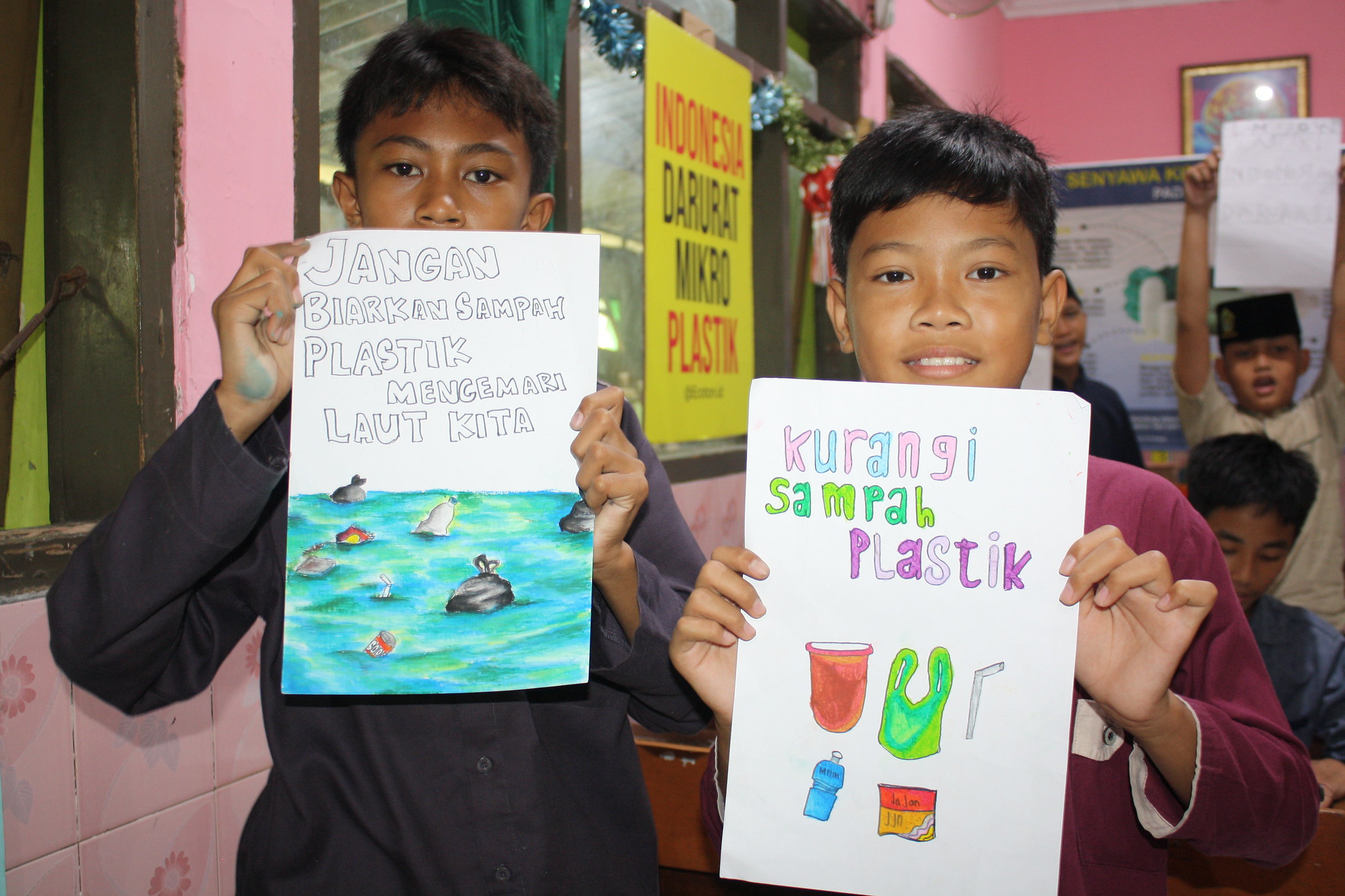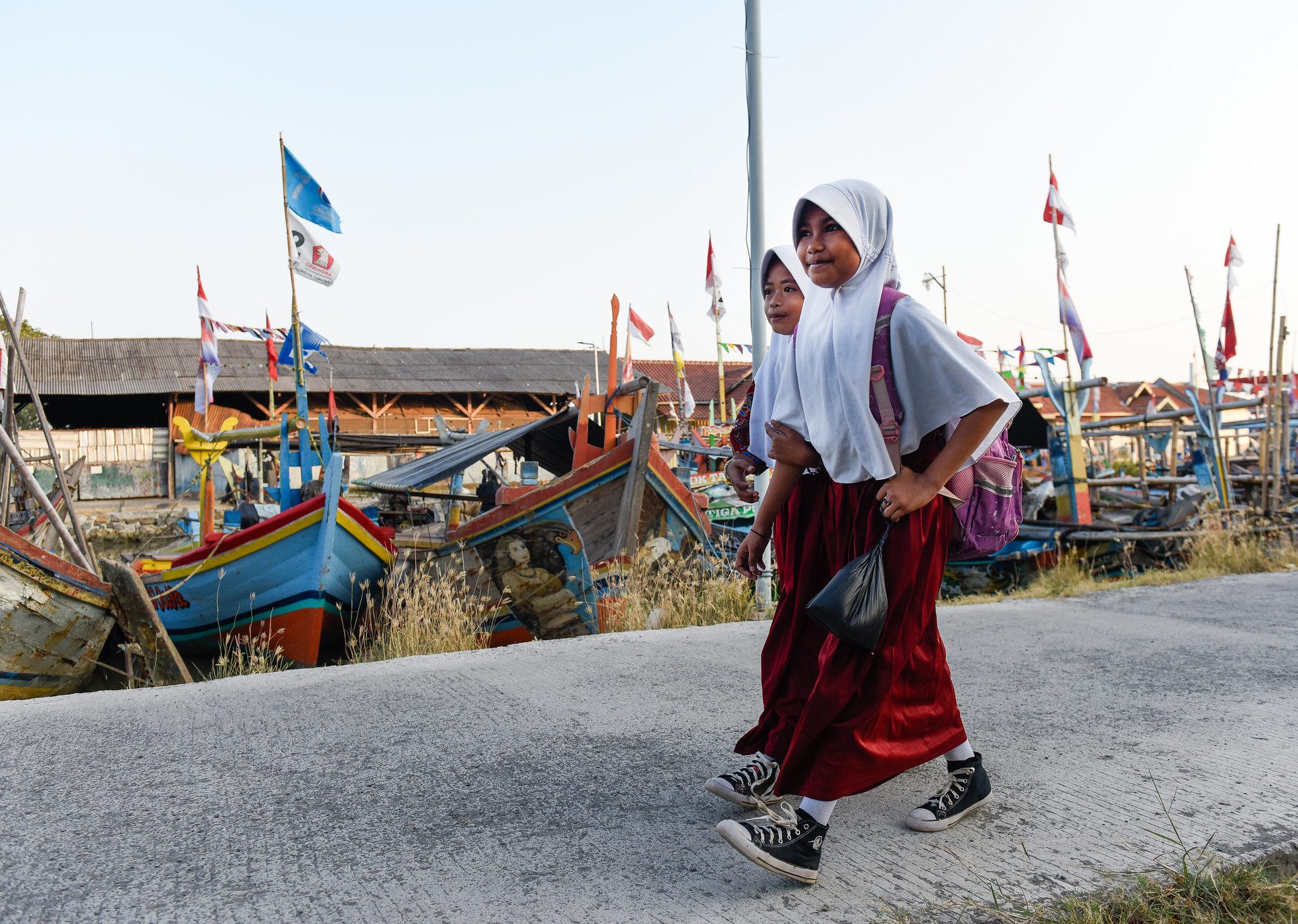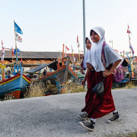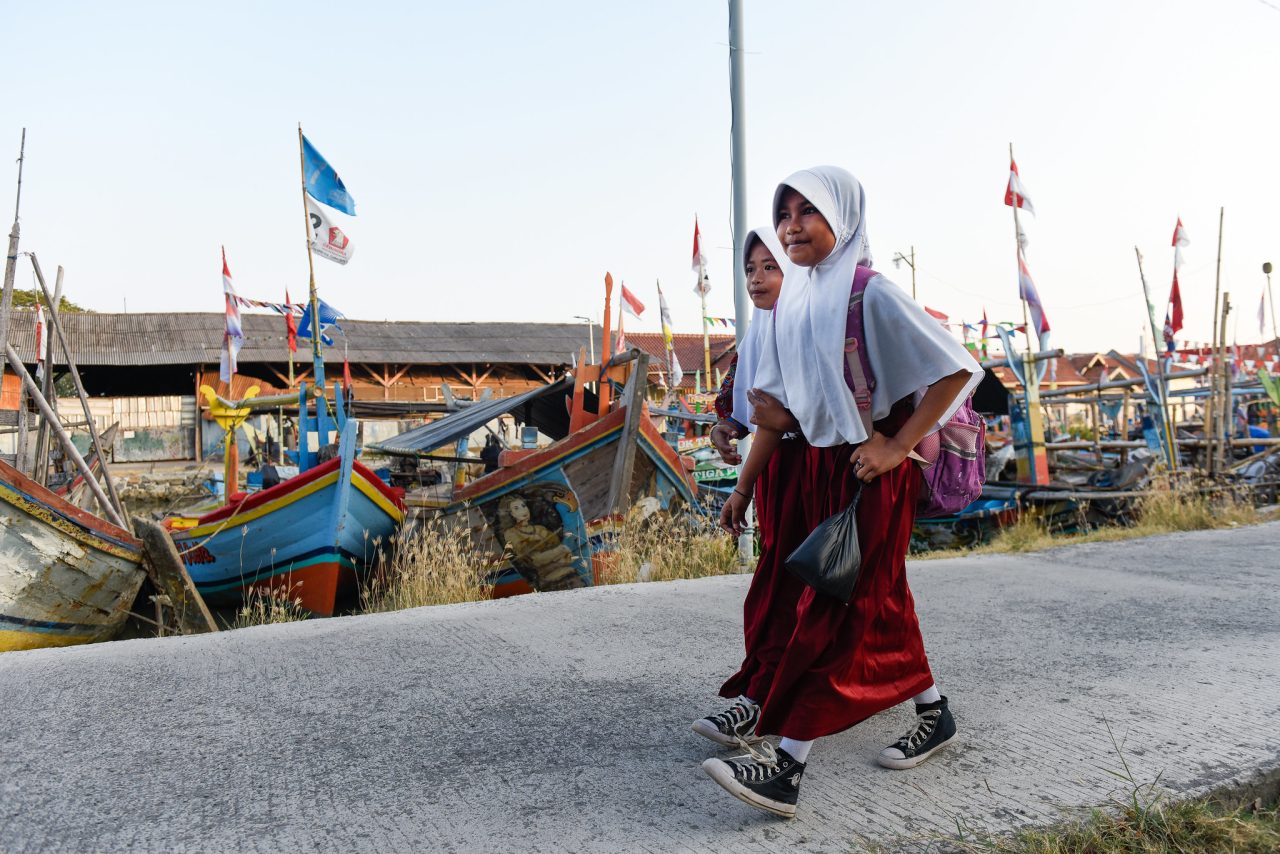 Dua siswa sekolah dasar berjalan menuju sekolah mereka di pesisir Cirebon. Di desa ini, banyak keluarga bergantung pada hasil laut untuk mencari nafkah, namun perubahan iklim semakin mengancam mata pencaharian para nelayan tradisional.