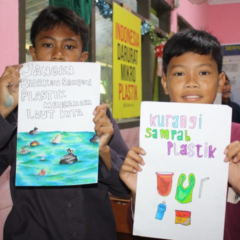 Dua siswa di Sidoarjo menunjukkan poster edukasi yang mereka buat tentang bahaya sampah plastik. Mereka mengajak semua orang untuk lebih peduli terhadap lingkungan dan mengurangi penggunaan plastik sekali pakai.