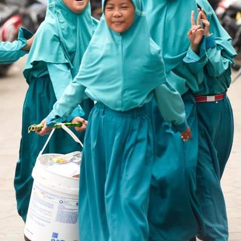 Beberapa peserta didik membawa tempat sampah di Madrasah Ibtidaiyah Assalafiyah, Sekolah Dasar Islam di Bode Lor, Kecamatan Plumbon, Cirebon, Jawa Barat, Indonesia, pada tanggal 5 September 2024.