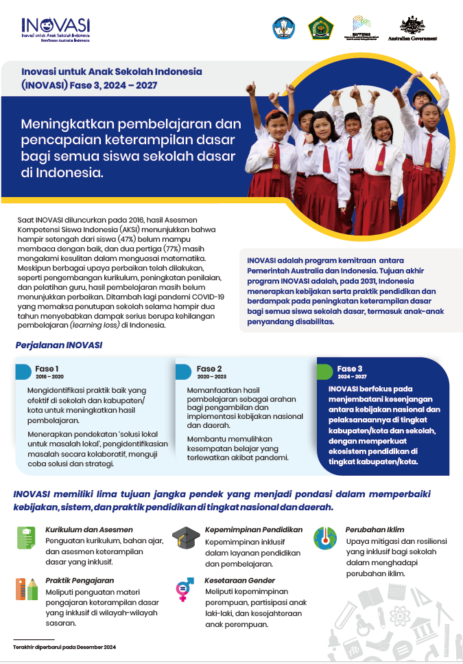 Pada fase 3 ini, INOVASI berfokus pada menjembatani kesenjangan antara kebijakan nasional dan pelaksanaannya di tingkat kabupaten/kota dan sekolah, serta memperkuat ekosistem pendidikan di tingkat kabupaten/kota. Harapannya pada 2031, Indonesia memiliki dan menerapkan kebijakan serta mempraktikkan pendidikan inklusif yang berdampak pada peningkatan keterampilan dasar bagi semua siswa sekolah dasar, termasuk anak‑anak penyandang disabilitas.